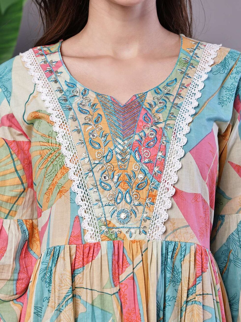 This stylish, tiered tunic mini-dress offers a beautiful flared silhouette with a playful, movement-filled skirt. It features an intricately detailed V-neckline with lace and threadwork, and is finished with a trendy fringe/tassel trim on the sleeves and hem. It’s a versatile and comfortable statement piece perfect for a modern bohemian look.